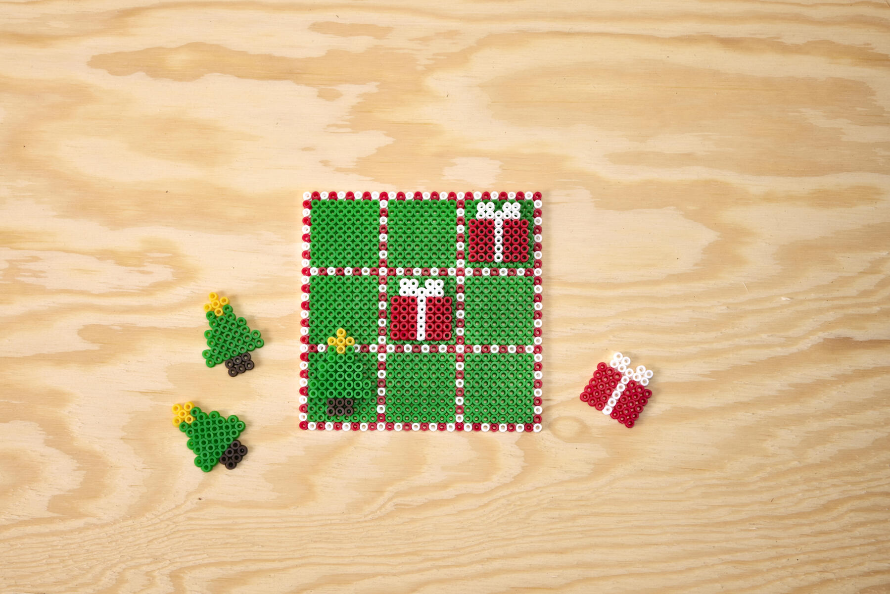 Skriv ut malen eller følg mønsteret på skjermen. Legg bakepapir over perlene og stryk langsomt med strykejern til alle perlene har smeltet sammen (men ikke i platen). Både strykejern og smeltet plast er veldig varmt og kan gi brannskader, og dette bør derfor gjøres under oppsyn av voksne. Legg noe tungt over og la figurene avkjøles. Tips! Bruk en strikkepinne for å løsne motivet fra platen.