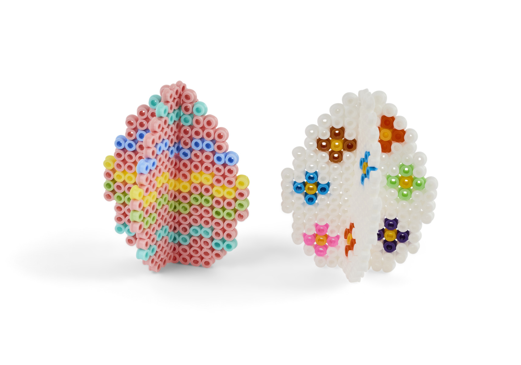- Legg bakepapir over perlene og stryk langsomt med strykejern til alle perlene har smeltet sammen (men ikke i platen). OBS! Få hjelp av en voksen når du skal stryke. Både strykejernet og perlene blir veldig varme. Legg noe tungt over og la figurene avkjøles.
