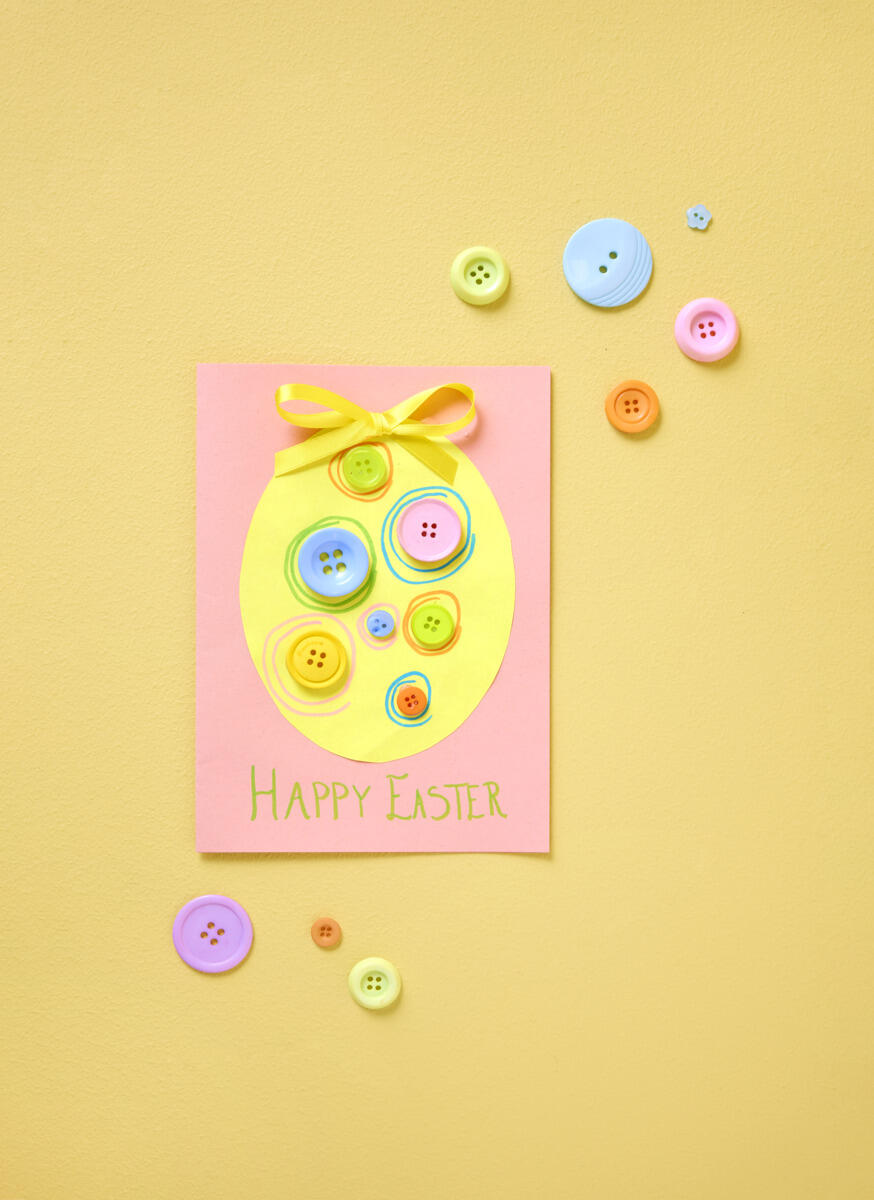 - Pynt egget med knapper i ulike farger og størrelser. Tegn små sirkler rundt knappene med tusj.