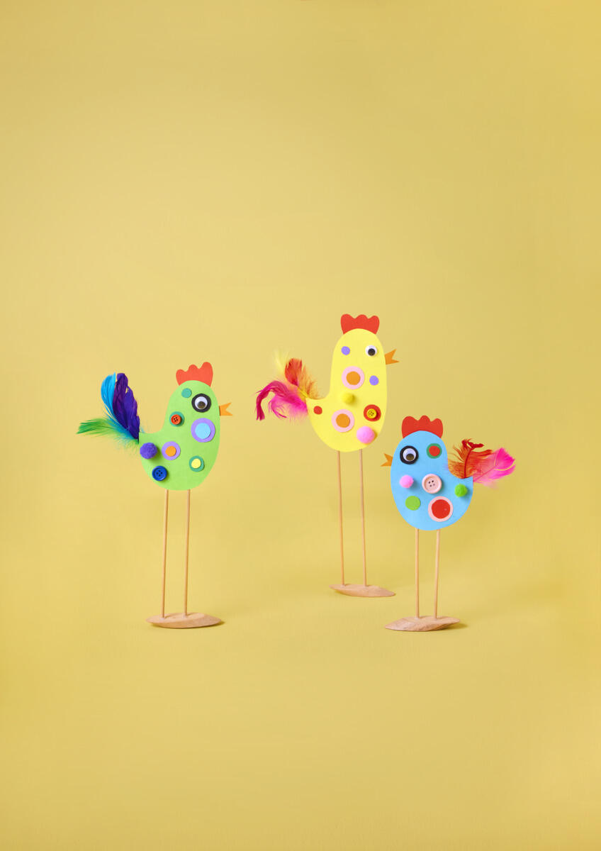 - Klipp ut et nebb, og bruk et stivt materiale som for eksempel dekorasjonspapp eller filt til kammen. Lim alt på den ene malen: nebbet, kammen og fjærene. Knekk blomsterpinner til ønsket lengde og lim de nederst som bein. Lim eller stift sammen kroppen.