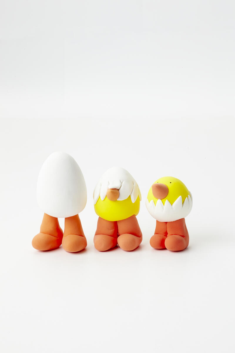 Begynn med å lage oransje leire ved å blande gul leire med en liten bit rød leire. Forme til bein, føtter og nebb. Lag egg av den hvite leiren, og fest på bein og føtter. Kyllingene formes av den hvite leiren. Mal på øyne av dekorasjonsfarge med en nål.