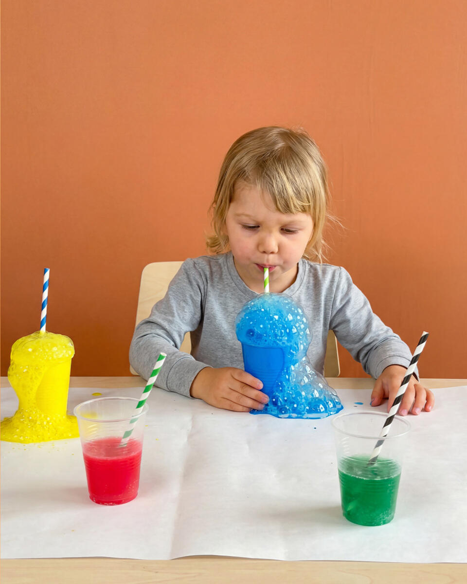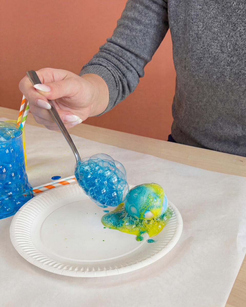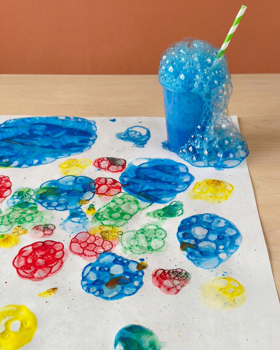 - Sett sugerøret i en av fargene og blås forsiktig ned i væsken for å lage bobler. Øs opp boblene med skjeen og mal egg på arket. Bytt farge, blås flere bobler og la dem sprekke. Mønstrene blander seg fint!