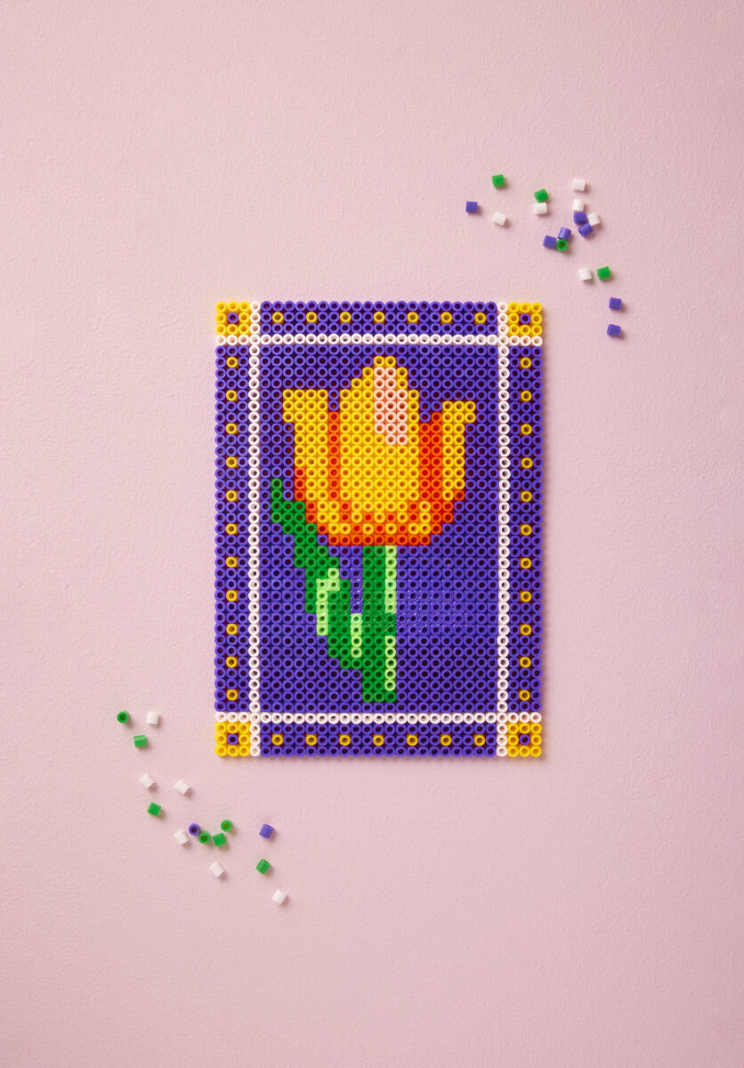 - Legg bakepapir over perlene og stryk langsomt med strykejern til alle rørperlene har smeltet sammen (men ikke i platen). OBS! Få hjelp av en voksen når du skal stryke. Både strykejernet og perlene blir veldig varme. Legg noe tungt over og la figurene avkjøles.