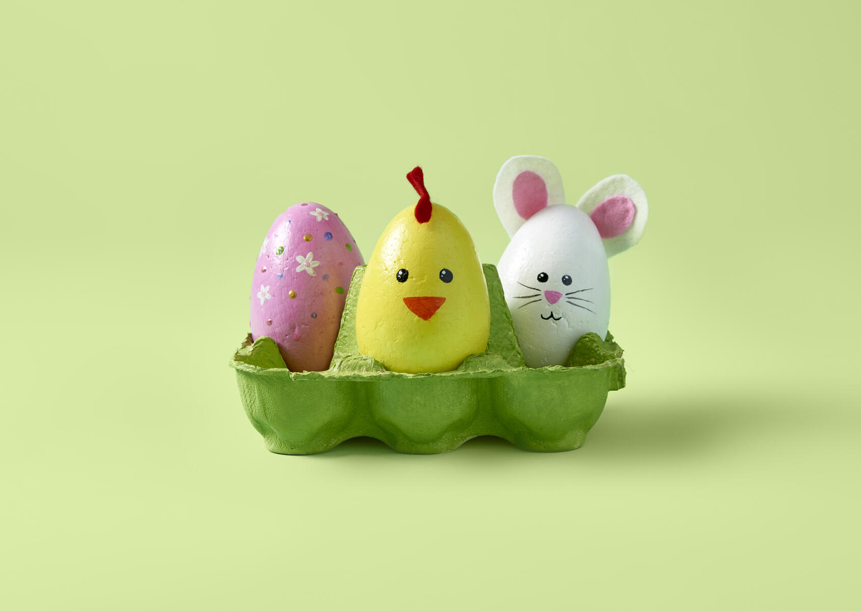 Mal isoporeggene samt eggekartongen. Pynt eggene med tusj eller klipp ut detaljene i filt som limes på figurene.