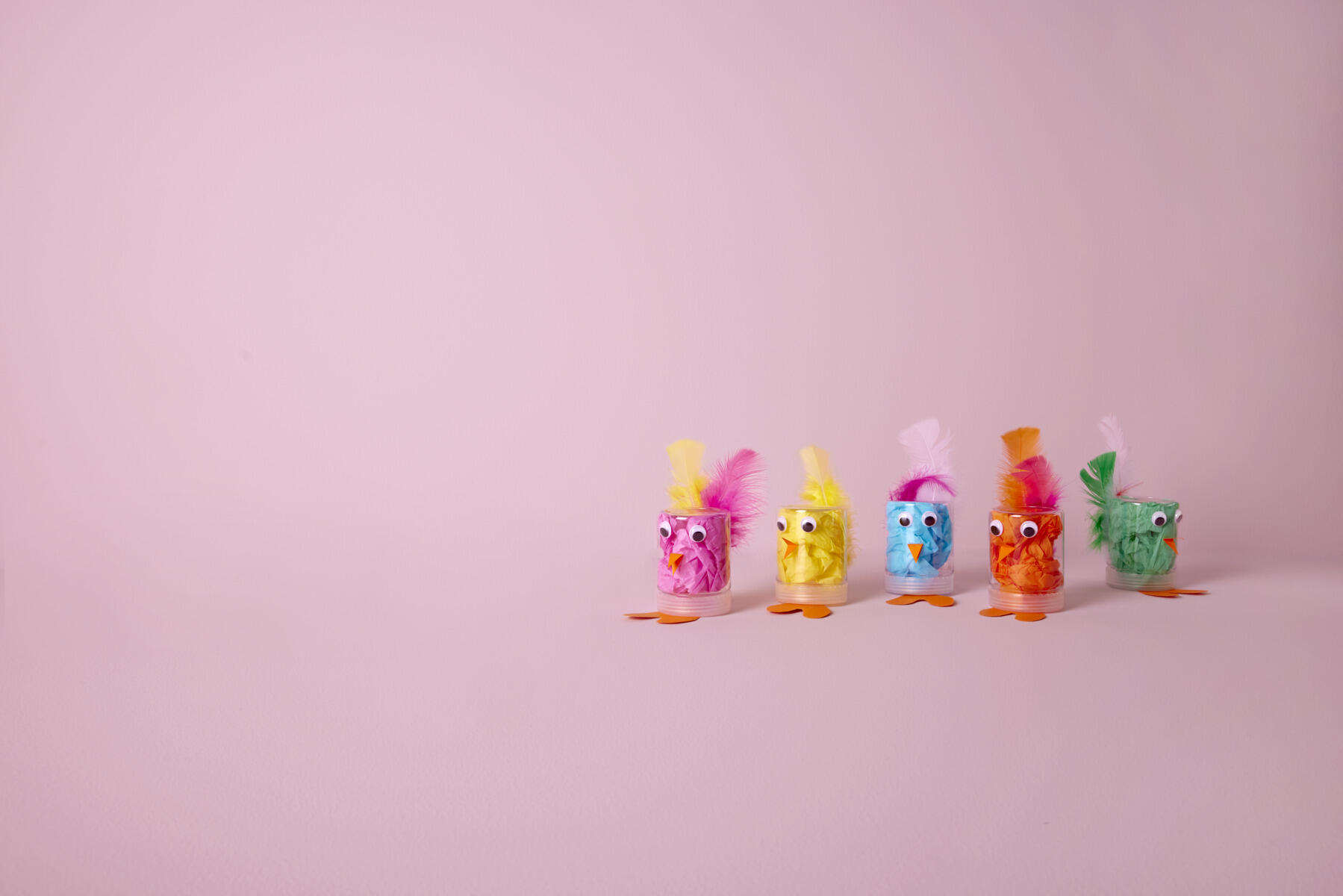 - Lim på plastøyne og noen fargerike fjær på baksiden av boksen.