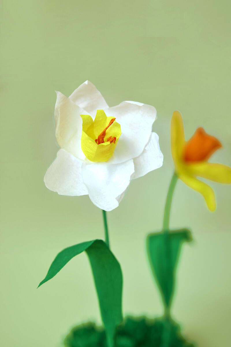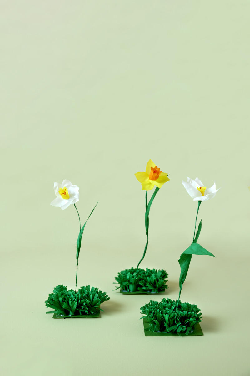 - Legg malene på kreppapiret og klipp ut delene. Vi har brukt hvitt, gult, oransje og grønt kreppapir. Det skal være 6 kronblader, 1 trompet/kronrør og 1–2 blader. Til støvbærere og stilk kan dere klippe remser ca. 1,5 cm brede. Lengde: støvbærere ca. 3 cm, stilk ca. 1 meter.