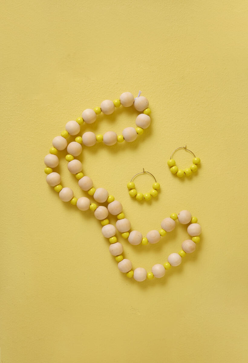 Smykke: klipp av en lang bit med strikk, og tre på trekuler/perler i annenhver farge. Knyt endene sammen når du er fornøyd med lengden.