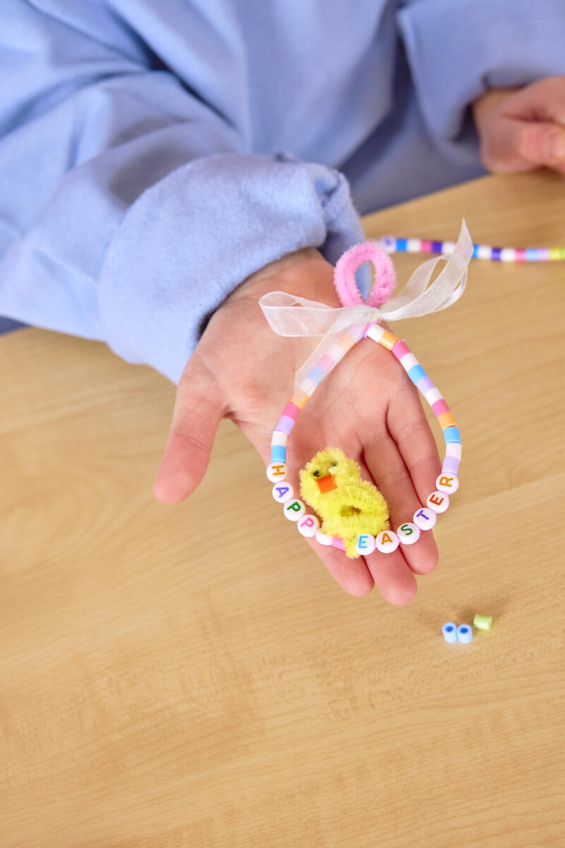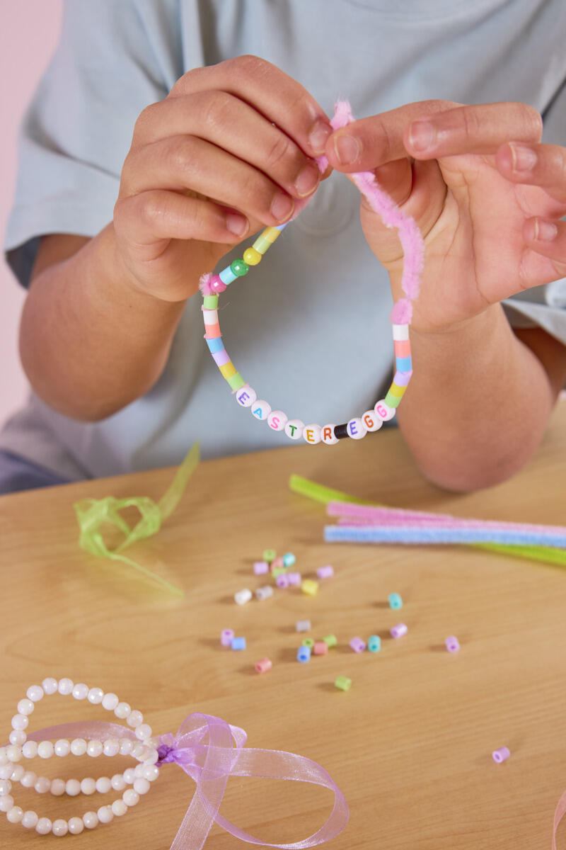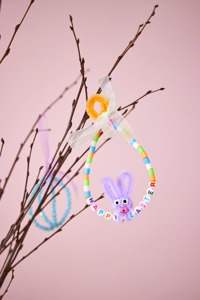 - Bruk en piperenser og tre på rørperler samt bokstavperler. Skrive en kort påskehilsen. Dette gir en fin mulighet til å øve bokstaver og språklig bevissthet. Husk å la det være litt plass i endene. Form piperenseren som et egg og tvinne sammen på toppen.