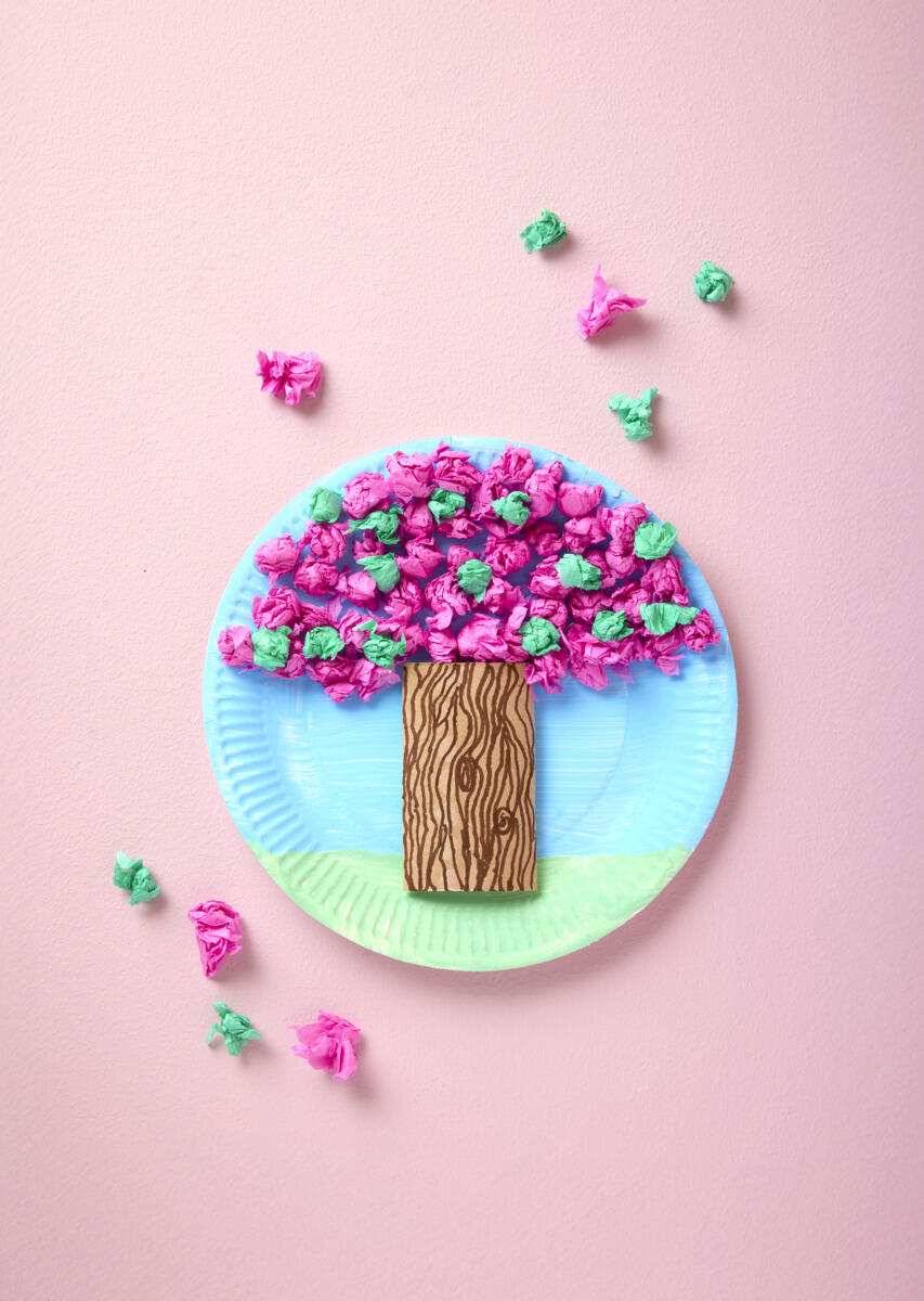 - Klem en dorull den sammen slik at den blir flat. Tegn stammen med tusj og lim den fast på tallerkenen.