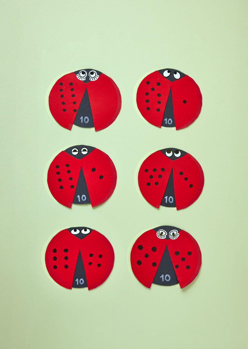 - Tegn med tusj 10 svarte prikker som er delt opp på ulike måter på vingene. På den første marihønen kan dere tegne alle 10 prikkene på venstre vinge (10+0=10). På den neste marihønen kan dere tegne 9 prikker på venstre vinge og 1 på høyre (9+1=10). Fortsett slik med 8+2=10, 7+3=10, 6+4=10 og 5+5=10.