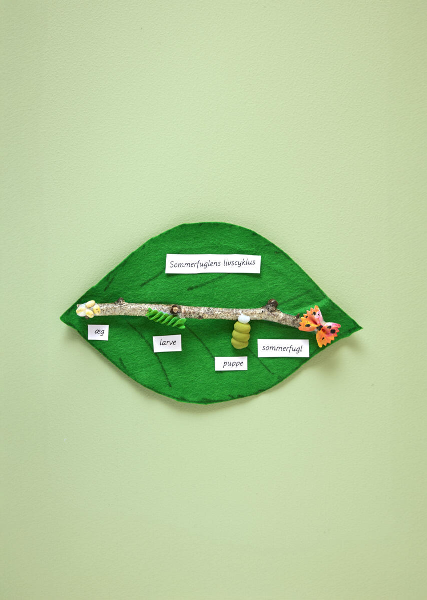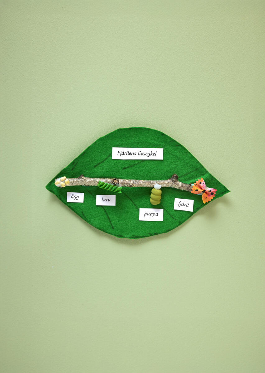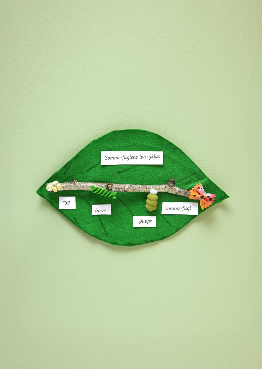 - Om man ønsker kan man skrive eller lime små lapper ved de forskjellige stadiene (egg, larve, puppe, ferdig sommerfugl).