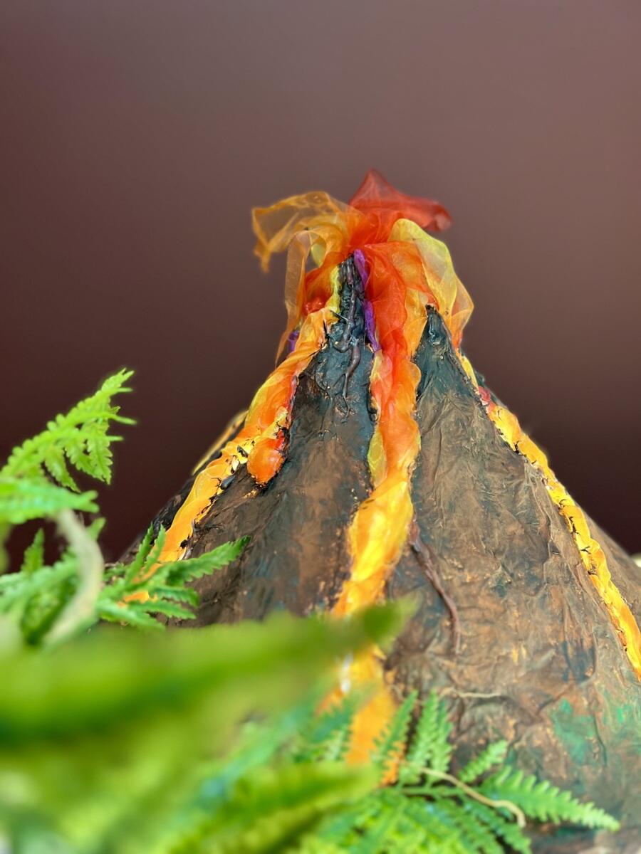 - Klipp til slutt ut «flammer» i gul, oransje og rød organza. Samle dem som en liten bukett og sett de ned i vulkanens krater som et vulkanutbrudd.