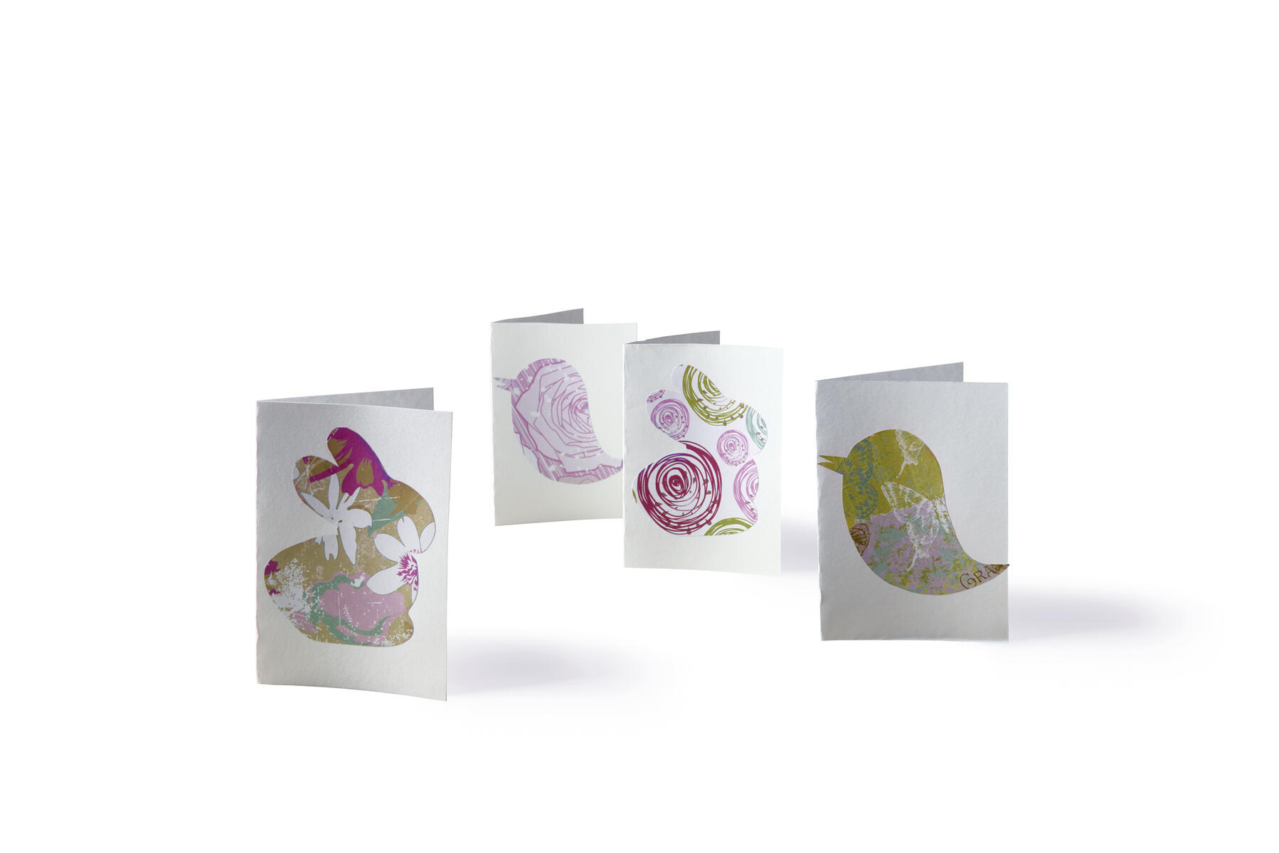 Lag kort av hvit papp. Klipp ut ulike påskefigurer i mønstret hobbypapir og lim på kortet.