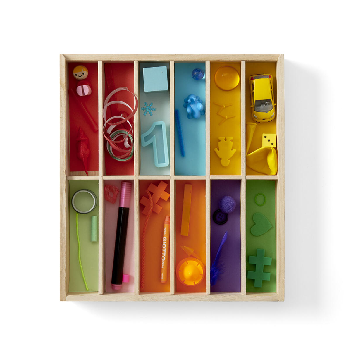 Bruk en eske med rom, vi har brukt en treeske til fargeblyanter.