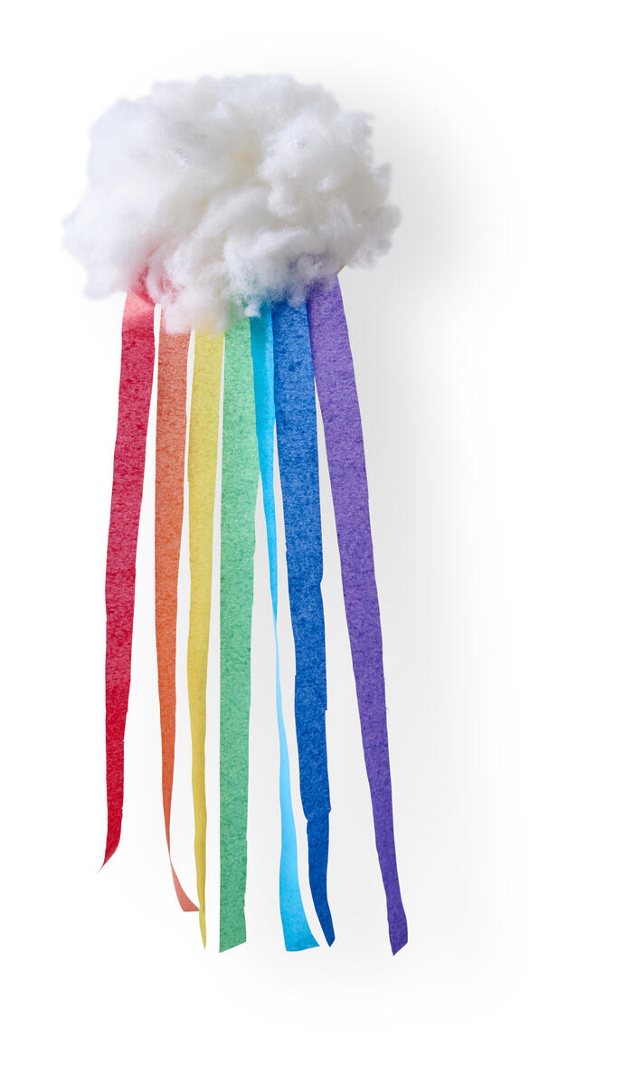Klipp strimler av silkepapir i fargene rød, oransje, gul, grønn, lilla, lys og mørk blå.