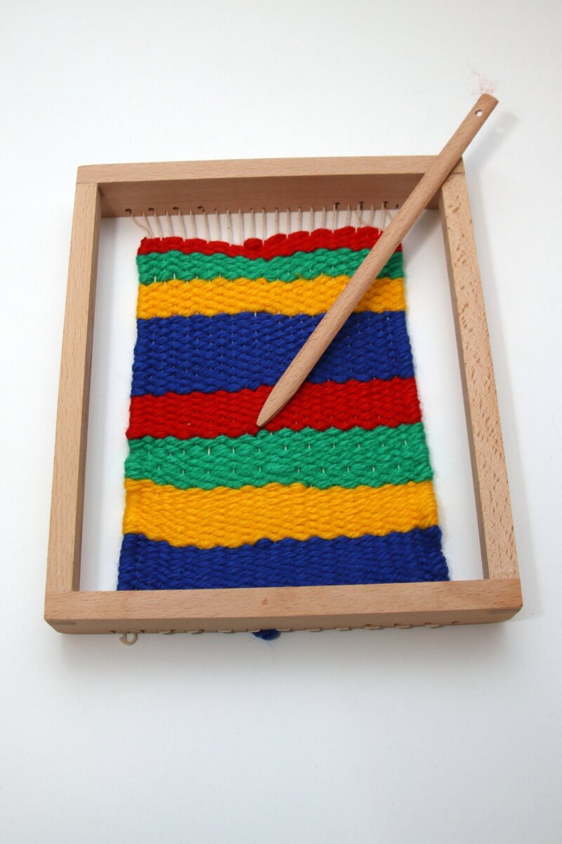 - Vev deretter med garn over og under renningsgarnet annenhver gang. Vev frem og tilbake, bytt garn/farge når du synes en farge er bred nok. La litt av garnendene henge løs på siden og fest alle til slutt.