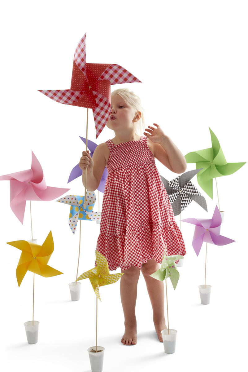 Lim to mønstrete A4-ark sammen om du vil ha mønster på begge sider. (Eller bruk vårt hobbypapir som har mønster på begge sider.) Lag kvadrat ved å brette nederste høyre hjørne diagonalt mot venstre og klipp av papir som stikker på utsiden av trekanten. Brett trekanten på midten igjen. Brett ut og du har nå fått en kvadrat med det kryss på midten. Klipp et snitt fra hvert hjørne inn mot midten av papiret. Lag hull øverst i høyre hjørne av hver av trekantene (totalt 4 hull). Bøy trekantene mot midten med hullene over hverandre og sett i en splittbinders. Fest vindmøllen på en blomsterpinne.